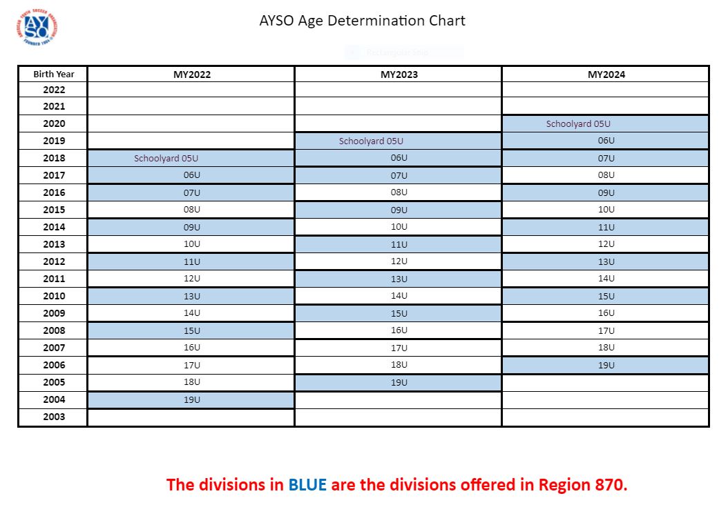 AYSO has changed from a school year registration to a birth year registration in order to align with other youth soccer providers' interpretation of the U.S. Soccer Player Development Initiatives.